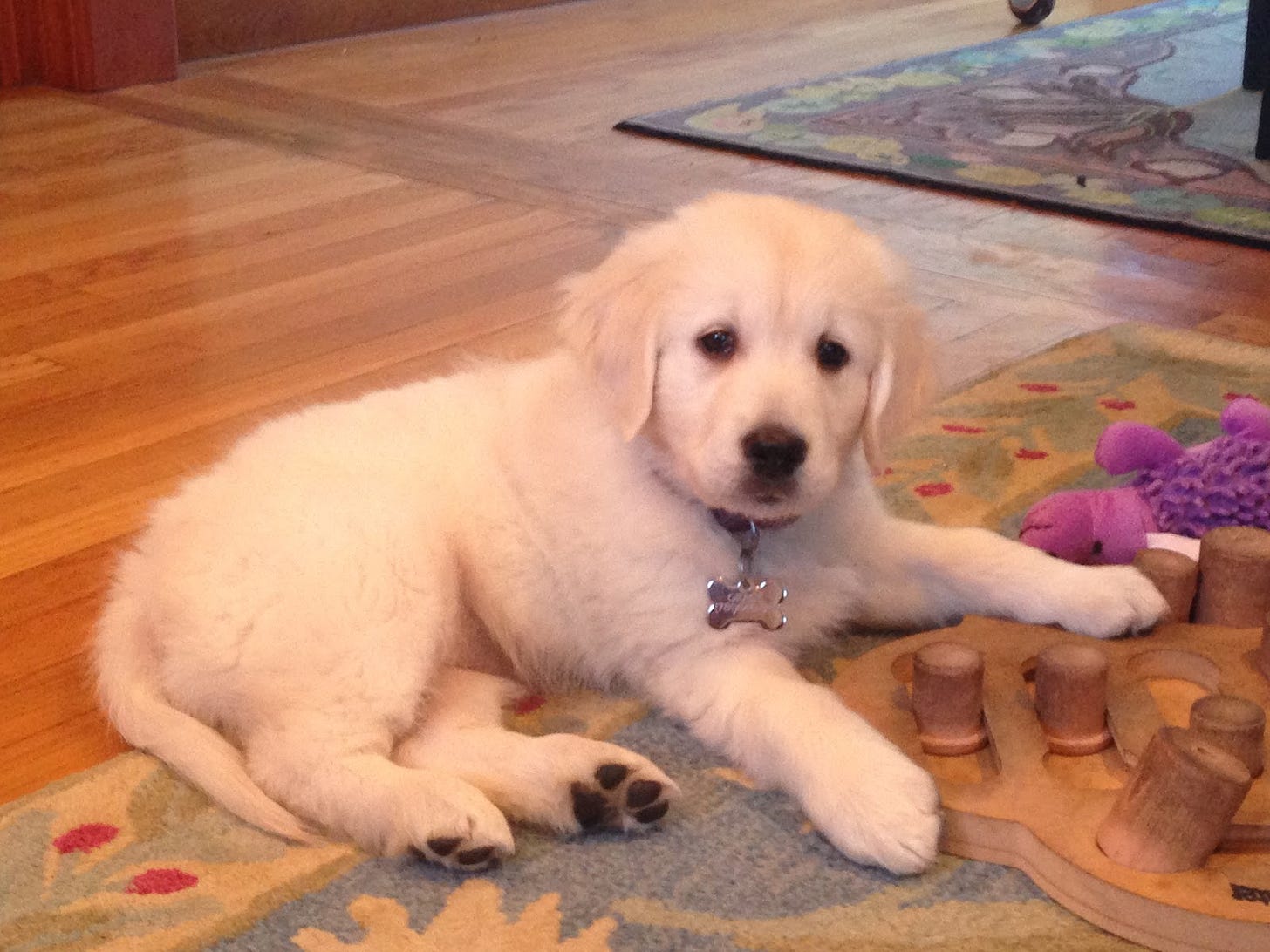 Those days are a decade behind us. At 11, Gracie is now only a year away from the culmination of a Golden Retriever's typical 12-year life span. Using the simple formula to compute her age in human years, with 7 human years for each dog year, she's 77. With a more nuanced calculation from the American Veterinary Association, she’s 69 (at 2, she was the equivalent of 24 human years, and each subsequent year has added 5 human years). Either way we count, our lifespans have converged. When we first met, she was a baby, and I was middle aged. Now, regardless of how we run the numbers, we have become peers. We are both seniors, both of us rounding the final curve in the trail.